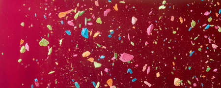 Crumbs of a multicolored chalk fly on a vinous background. Joy, Carnival. Panorama. Game for children