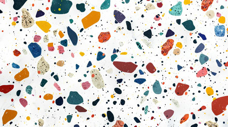 Colorful abstract terrazzo seamless pattern with irregular scattered shapes in vibrant hues of blue, pink, yellow, and black on clean white