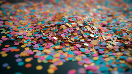 macro shot of vibrant confetti on a glittery surface, created with generative ai