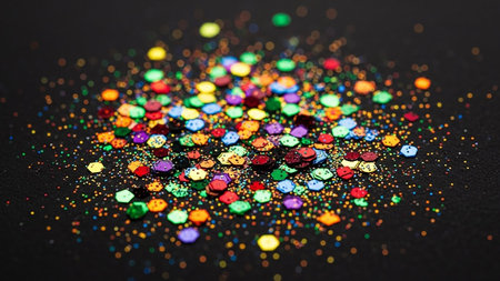 Captivating image of vivid glitter and confetti in various shapes, laying on a dark surface, perfect for representing celebrations, parties, and joyful occasions.