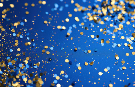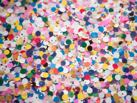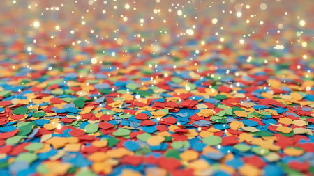 Across showing close up shot of colorful confetti scattered across a surface with bokeh lights in the background creating a festive and celebratory atmosphere for...