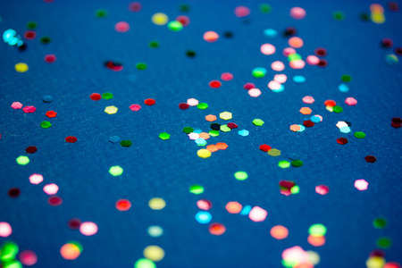 Multicolored confetti scattered on a dark blue surface top view. Lots of round sequins. Celebration, party, fun concept. Fun abstract festive background. Shimmering small elements for decor.