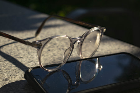 Selective focus of glasses, smartphone on black background and copy space with light and shadow