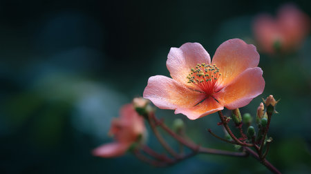 Delicate Peach Flower Blossom Against a Deep Green Background