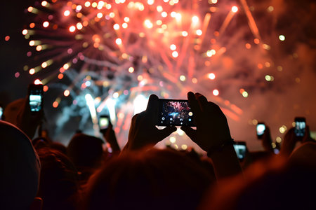 Hands holding smartphones to photograph colorful fireworks in a festive, illuminated night sky