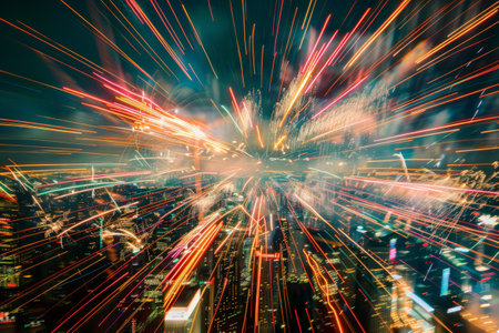 A blurry cityscape with neon lights and a tall building in the background. Concept of movement and energy, as if the city is in constant motion
