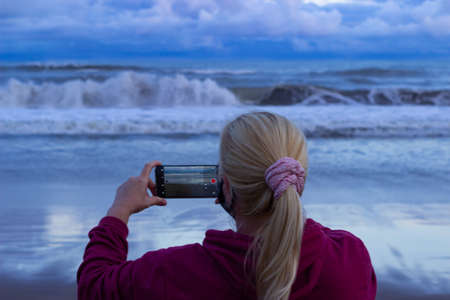 A blonde girl in a pink jacket takes pictures of the sea with a smartphone.