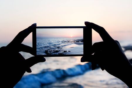 woman hands holding mobile phone at sunrise over sea bay. Taking photo of sunset over rocks in water by mobile phone. Selective focus on smartphone