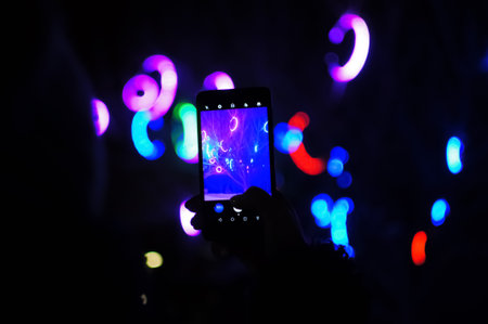 A person recording a concert with cellphone. Selective focus. Copy space.