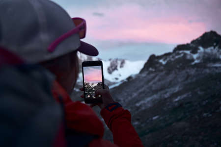 mountain tourist with smartphone taking a picture of a glacier peaks at sunset