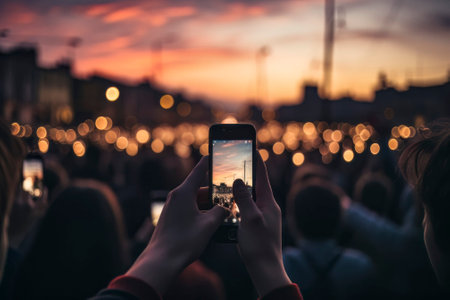 A thought-provoking image capturing a crowd engrossed in smartphones at sunset, symbolizing social media-induced detachment.