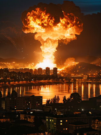 A spectacular nuclear explosion erupts in the night sky above a city, its fiery plumes creating a stark contrast against the urban skyline