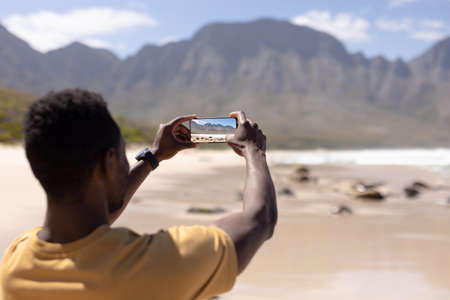 African american man taking photo of the mountains with smartphone on a beach by the sea. healthy lifestyle, leisure in nature.