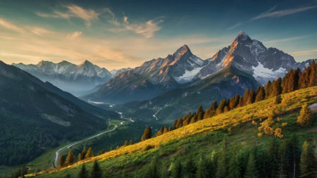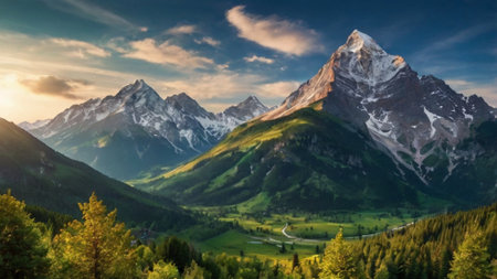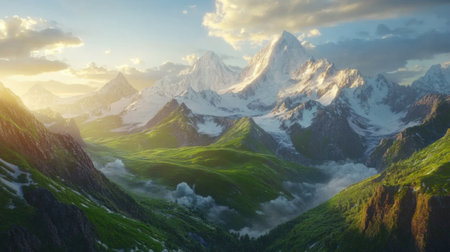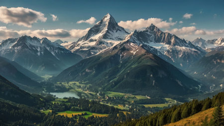 A tranquil landscape depicts a mountain range, a calm lake reflecting the sky, and lush green valleys. The composition uses natural colors, creating a serene and vast vista. The scene is lit by sunlight and suitable for environmental or travel content, conveying peace and natural beauty.
