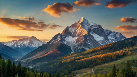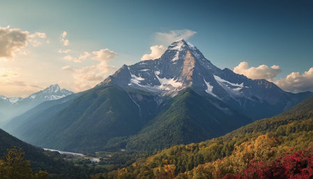 Mountain landscape with colorful autumn forest and snow-capped peaks
