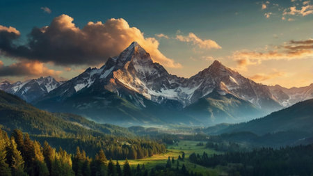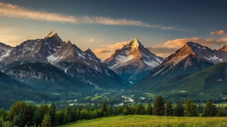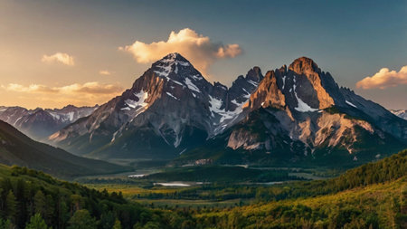 The panorama captures a breathtaking sunset casting golden hues over a majestic mountain range with alpine lakes nestled in valleys. Resplendent.