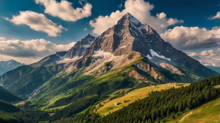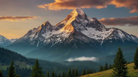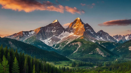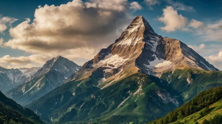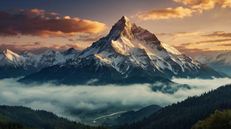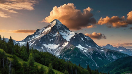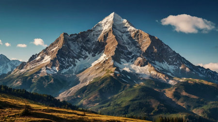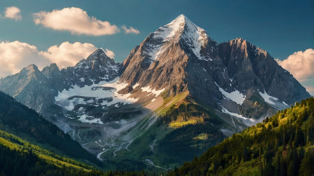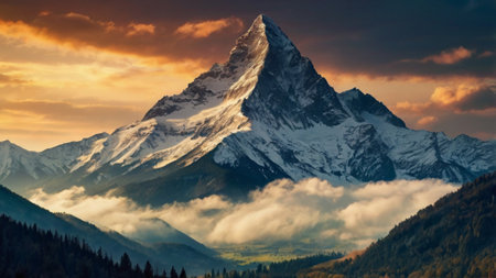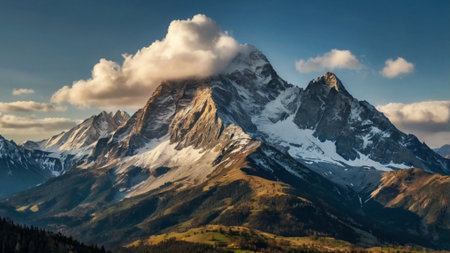 Majestic mountain peak in panoramic landscape, surrounded by snow and forest generated by artificial intelligence
