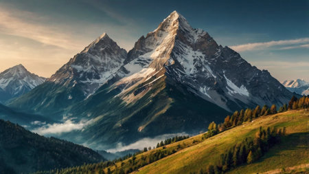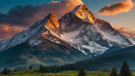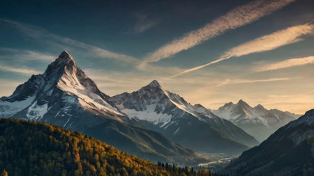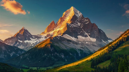Mountain landscape with snow-capped peaks at sunset in Switzerland