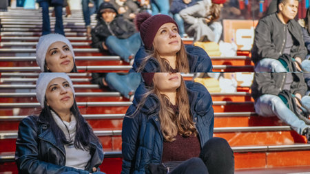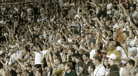 ODESSA UKRAINE - July 28, 2019: spectators at stadium. Crowds of fans in stands of football stadium during match Shakhtar (Donetsk) -Dynamo (Kiev). Grandstand with fans. Stands with football fans