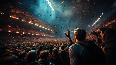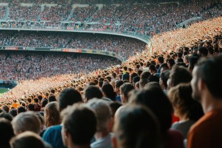 Crowd of fans at a soccer or football stadium cheering for their favorite team