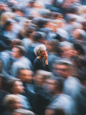 In a crowded location, one person stands out, shouting into their phone, while the surrounding crowd moves in a blur, capturing a moment of urgency.
