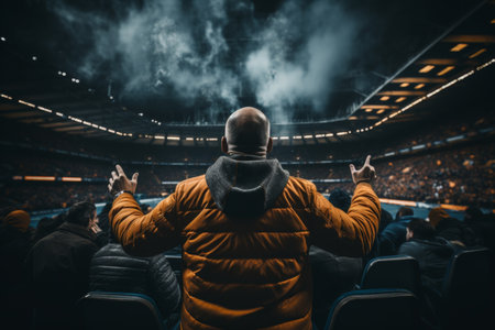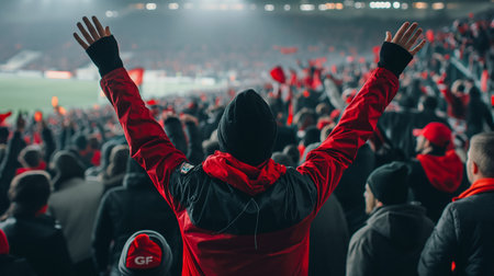Rear view of a soccer fan with raised hands at the stadium