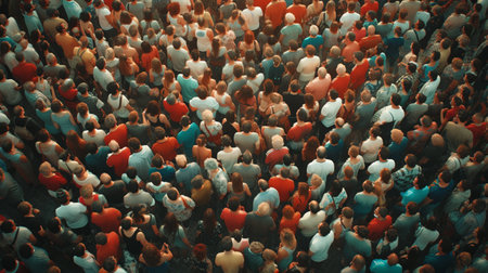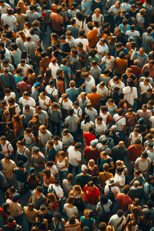 A lone man in a yellow jacket stands out amidst a dense crowd, viewed from behind, symbolizing individuality and isolation.