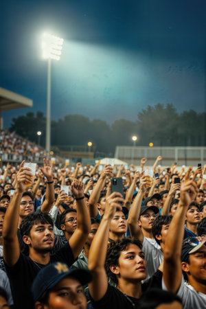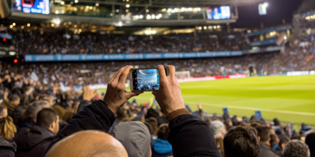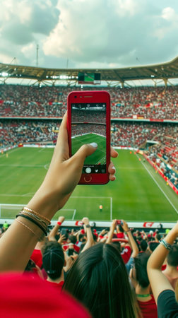 Fans on a soccer stadium recording the match with their smartphone