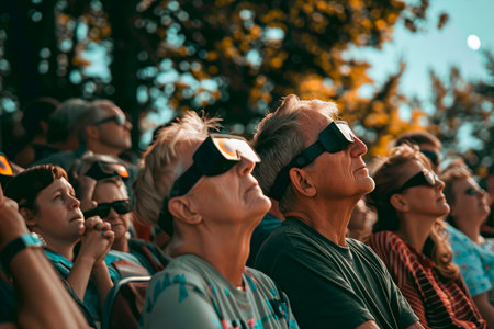 crowd of people with protective glasses watching a solar eclipse