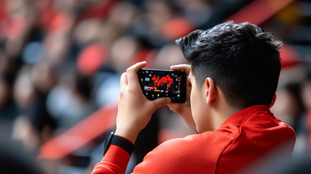 Over-the-shoulder shot of a young man in a red top, holding a smartphone horizontally to film a live event. His dark hair is styled and he wears a black wristband.