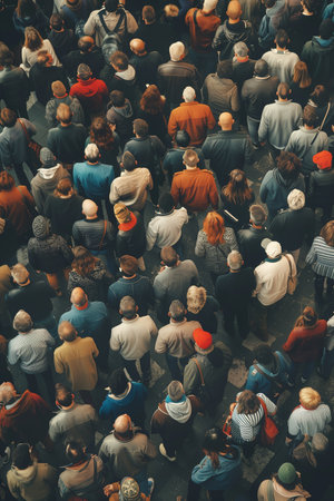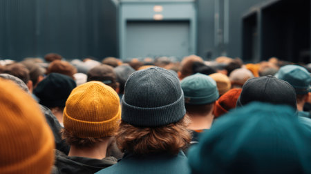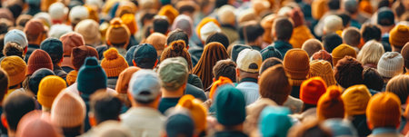 A crowd of people wearing hats and scarves in a large group, AI
