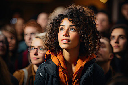 illuminated attractive blonde stands out from a crowd of anonymous people in the shadows