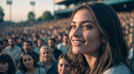 Portrait of a beautiful young woman with long wavy hair standing in the stadium, in the background of a crowd