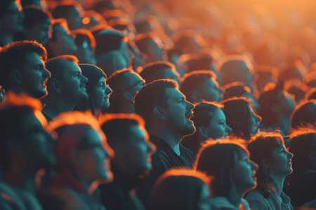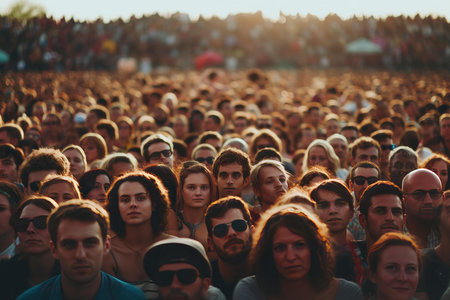Dense crowd of festival-goers enjoying an event at sunset with warm lighting