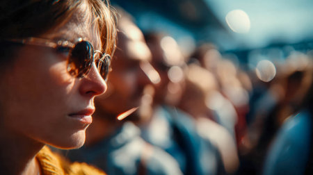 Handsome young man in sunglasses standing in front of crowd at music festival