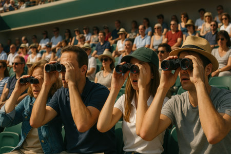Engaged spectators wearing casual clothing observe tennis match through binoculars expressing curiosity, excitement, and anticipation. Concept of professional sport, celebration, games, events.