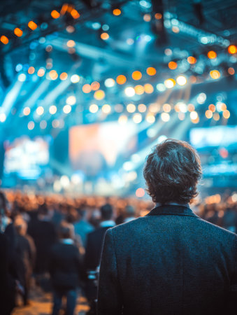 A captivated participant in sharp focus amid colorful stage illumination, surrounded by an energetic crowd immersed in a lively conference atmosphere.