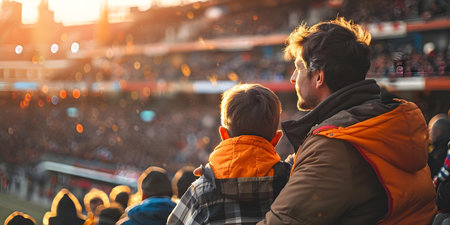 Father and son bonding at a rugby match amidst passionate fans, fostering unity. Concept Father and Son Bonding, Rugby Match, Passionate Fans, Unity, Sportsmanship