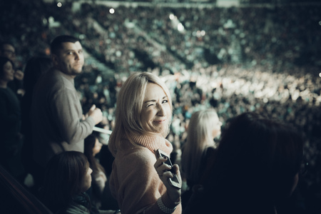 Girl is recording video with smartphone during a concert. Toned picture