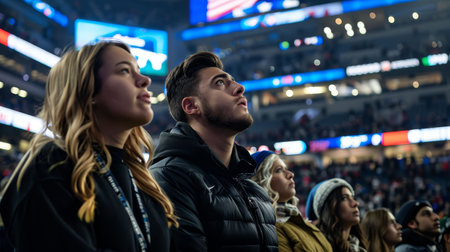 Concentrated anxious looking football fans waiting score goal football at stadium. Generative AI