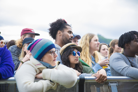Traena, Norway - July 7 2017: audience watching with emotion the concert of Norwegian gay choir Oslo Fagittkor at Traenafestival, music festival taking place on the small island of Traena
