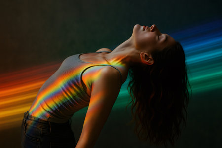 Dancer posing with rainbow light painting projected on body and background, creating a colorful and artistic atmosphere
