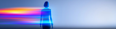 Vibrant, see-through human silhouettes arranged in orderly lines, highlighting harmony, acceptance, and interconnectedness in a luminous, contemporary environment.