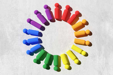 Abstract figures in rainbow colors in circle on concrete background, lgbtq + symbol, 3D illustration