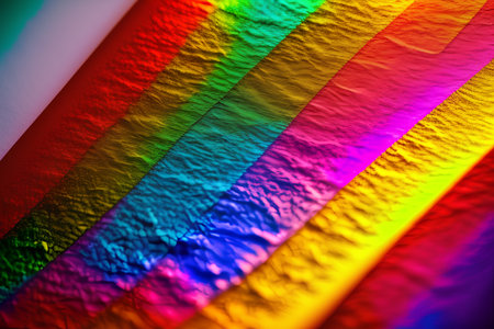 Diagonal stripes of vibrant rainbow colors illuminate a textured, possibly stone or wood, surface, creating a dynamic visual effect.