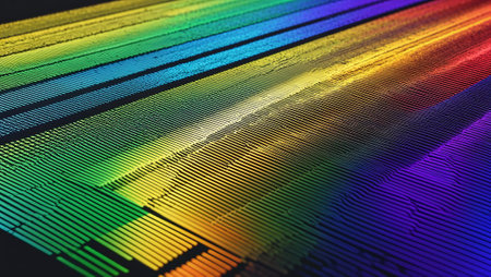 This abstract offers a close-up view of a textured surface composed of numerous parallel lines that flow downwards and converge towards the bottom. The lines are illuminated with a vibrant rainbow gradient, creating a rich tapestry of color that transitions from deep blues and purples on the left to bright reds and oranges on the right. The texture of the lines is apparent, giving them a slightly rough or granular appearance. The dark background provides a stark contrast, making the colorful...