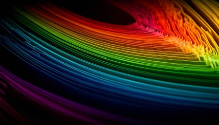 Abstract rainbow colored digital lines flowing and waving on a dark background, creating a vibrant and dynamic visual representation of data or sound. AI generated image
