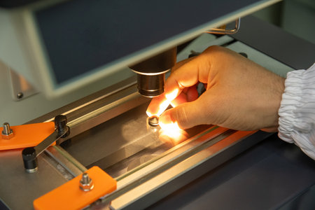 Hands of a scientist on a ontrol panel of an electron microscope.