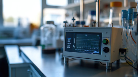 A close-up of a digital measurement device on a laboratory bench, displaying precise measurements for scientific use