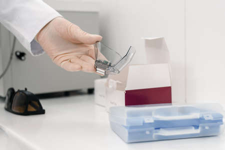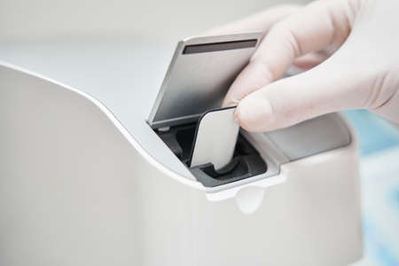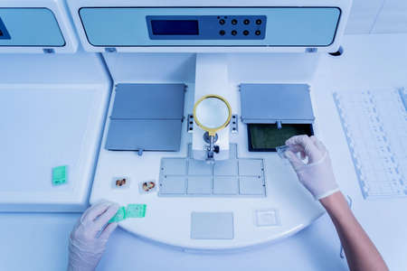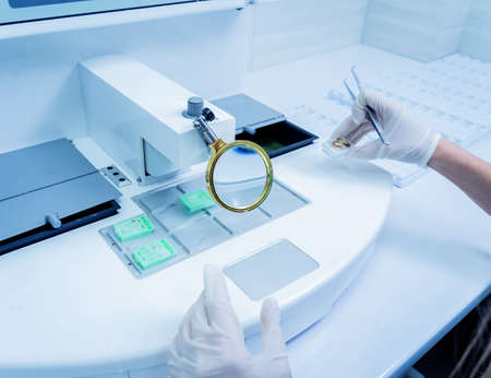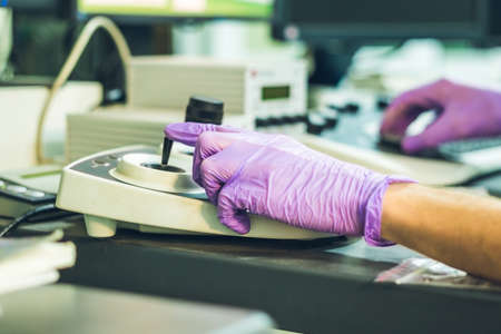 Hands of a technician with gloves using a machine at the scientific laboratory and working with medical samples